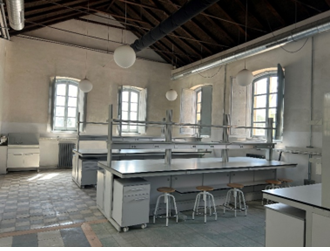 - Planta primera: El espacio principal se organiza de forma simétrica a partir del núcleo central del ascensor. A cada lado se ubica un laboratorio principal, que a su vez da acceso a un laboratorio más pequeño para prácticas especializadas. Todos los espacios están interconectados y cuentan con acceso a la cubierta.