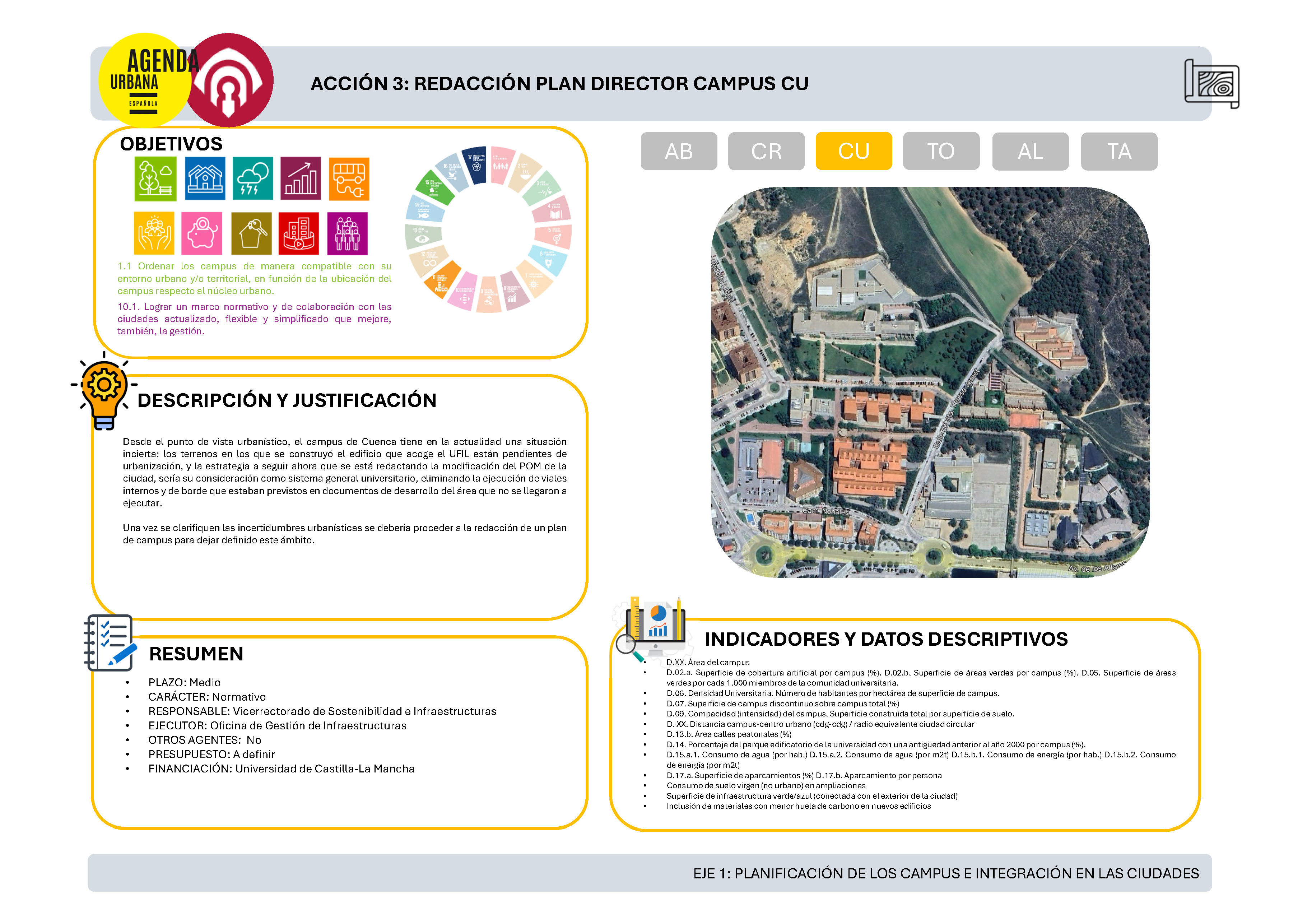 Actuaciones orientadas a la planificación urbanística de los campus universitarios y a su integración y conexión con el entorno urbano. Se contemplan planes para integrar los campus exteriores de Ciudad Real y Albacete, así como para los campus de Cuenca y Toledo (Fábrica de Armas).