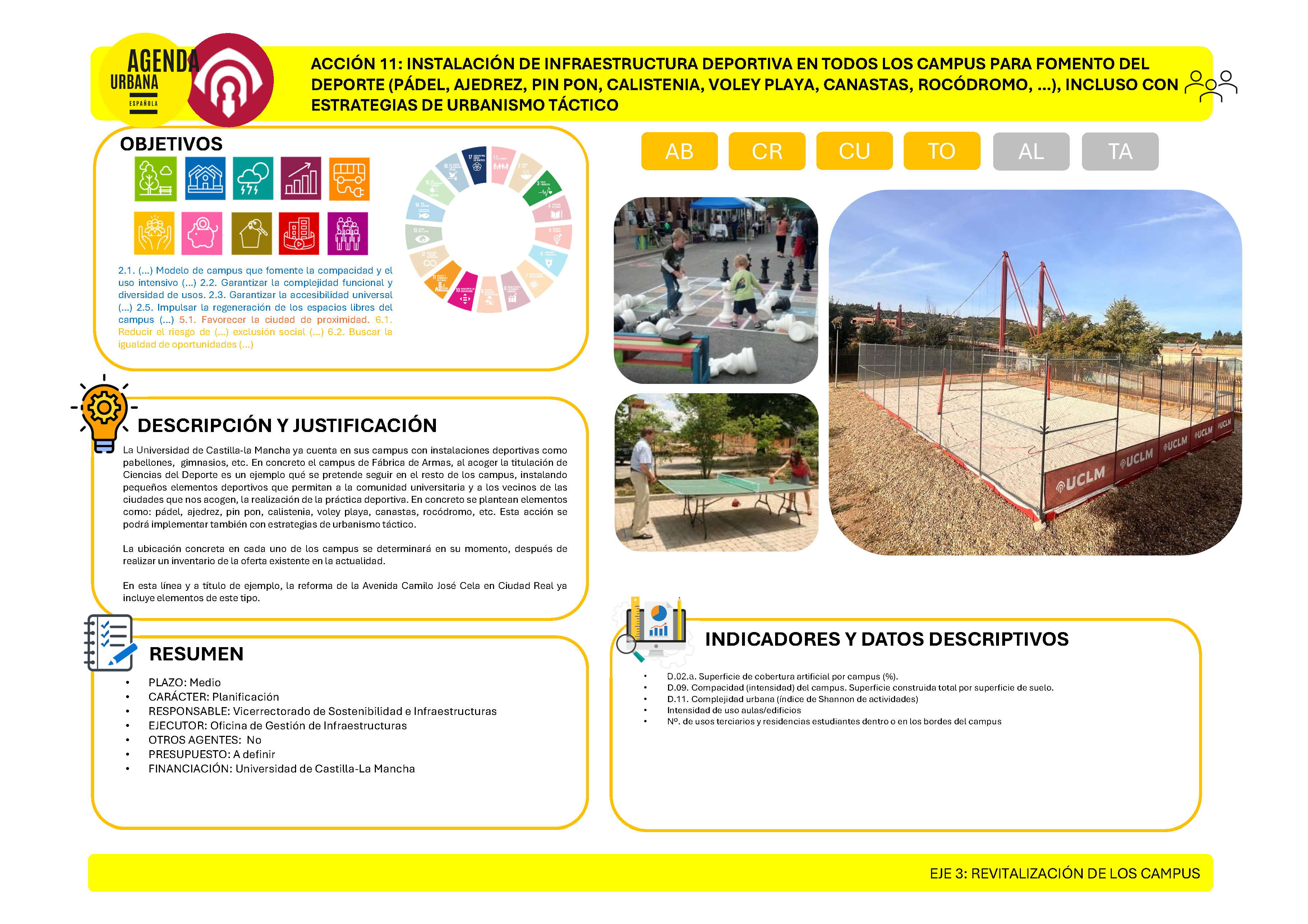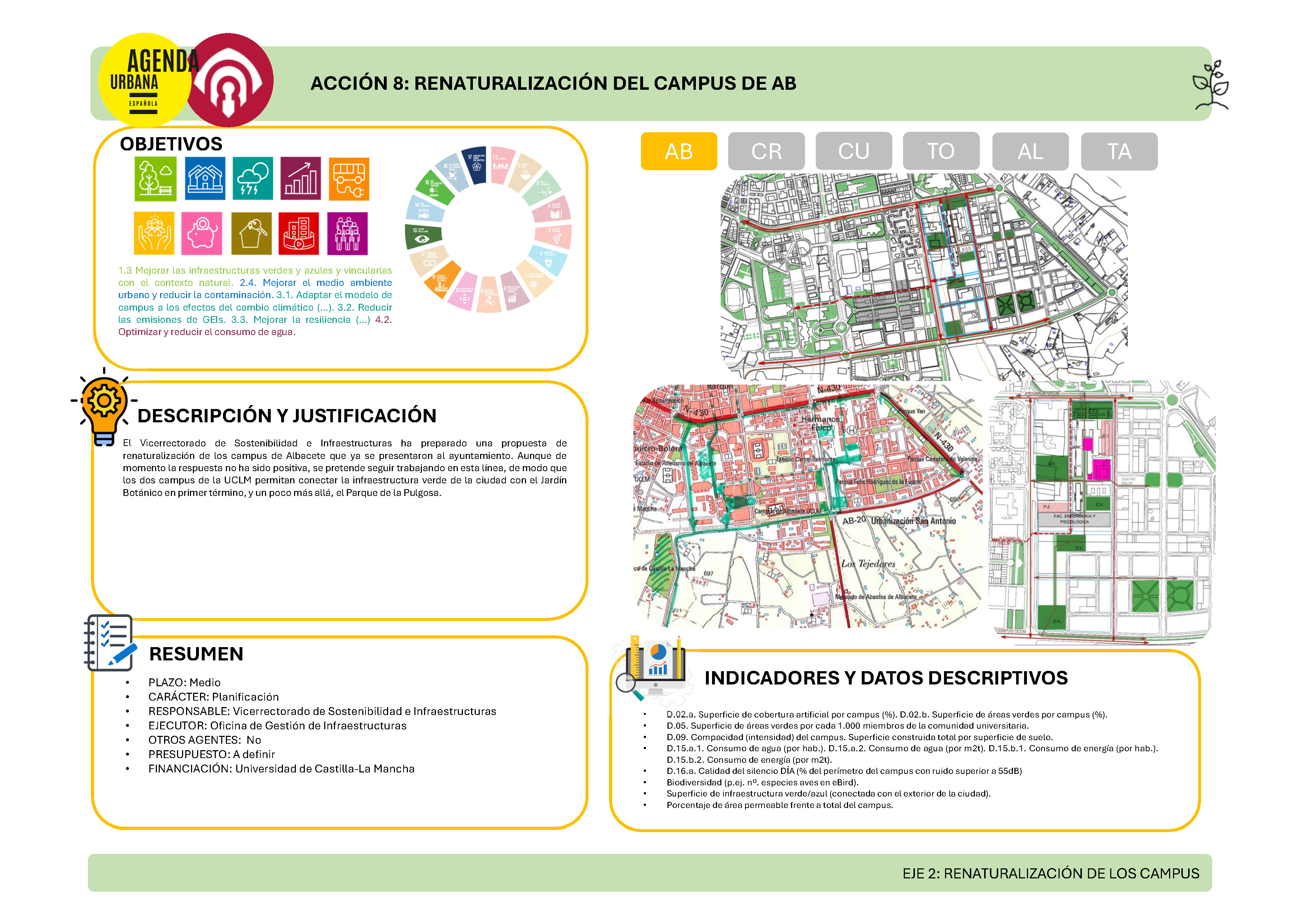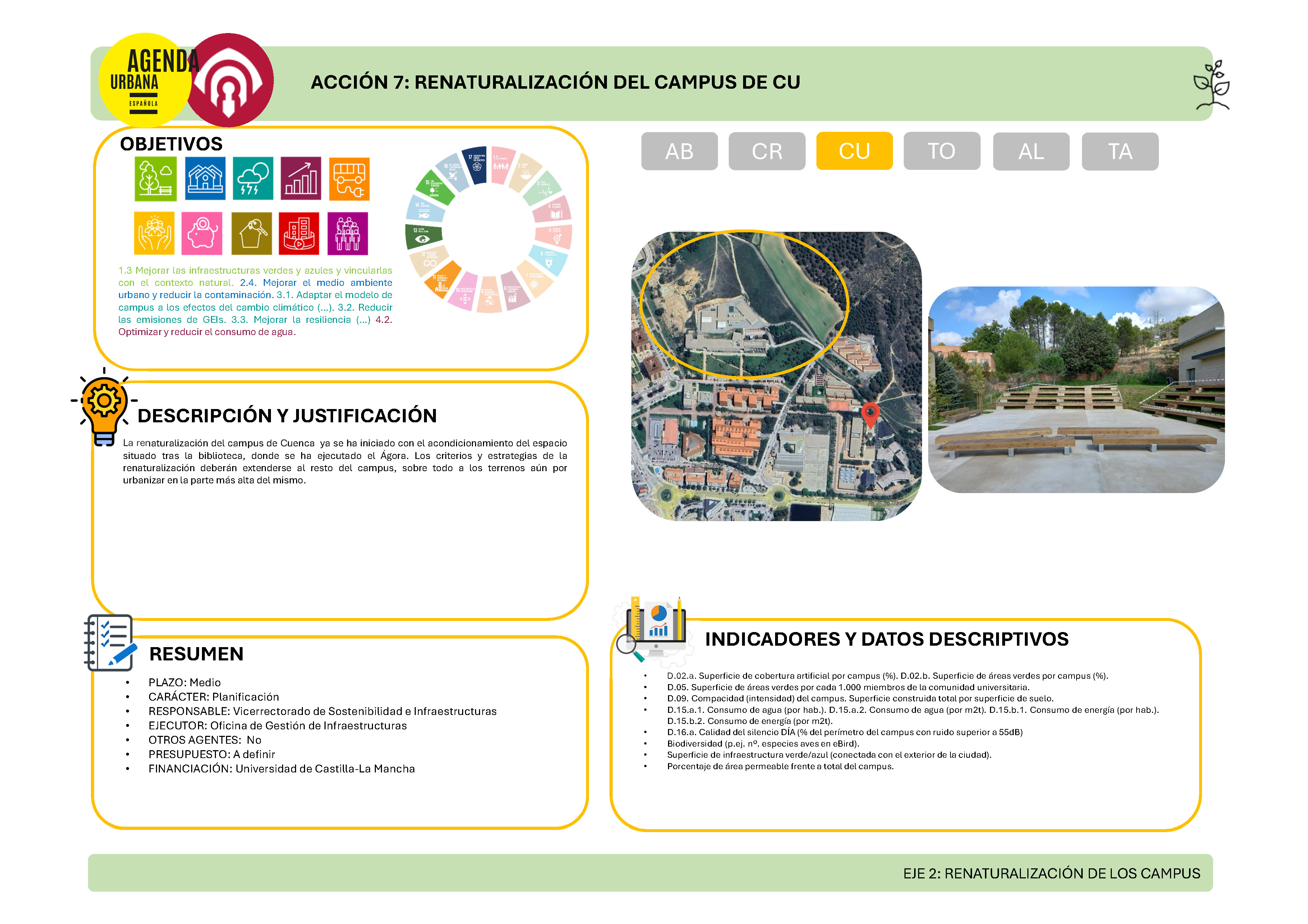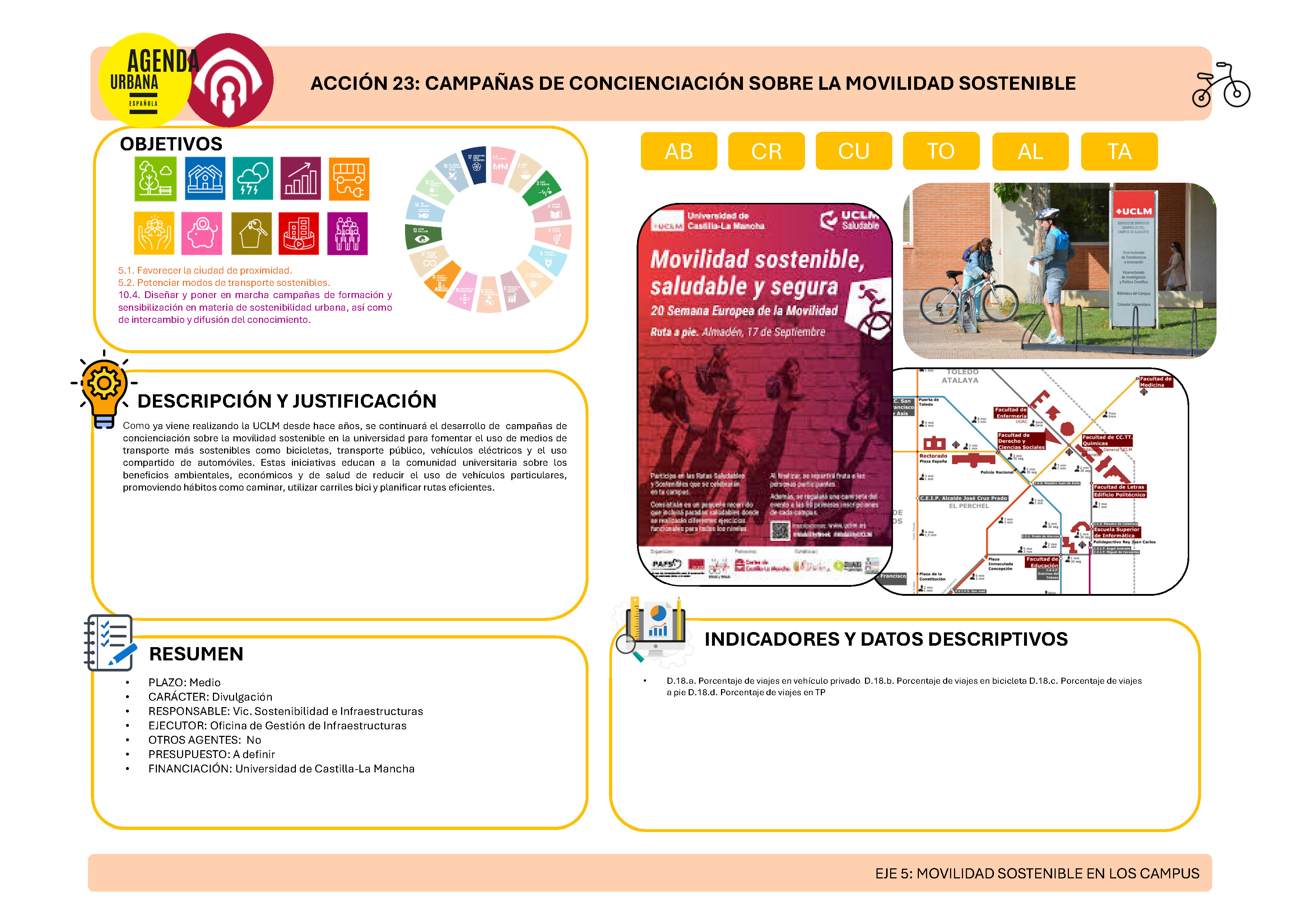 • Un Plan de Acción para la UCLM con 28 propuestas concretas, estructuradas en 7 ejes de actuación, para contribuir a la sostenibilidad urbana desde el ámbito de las competencias de la universidad y sus campus.