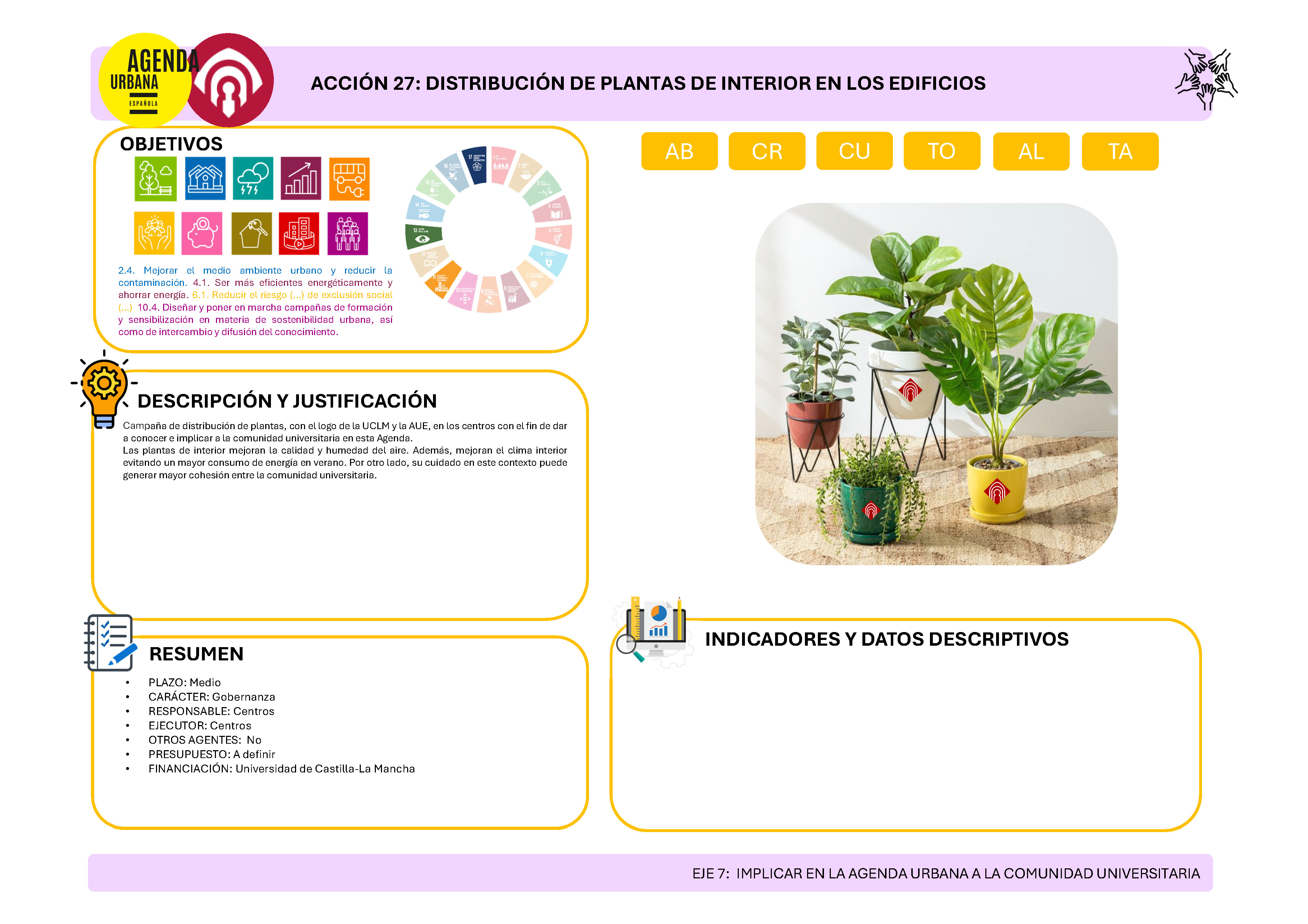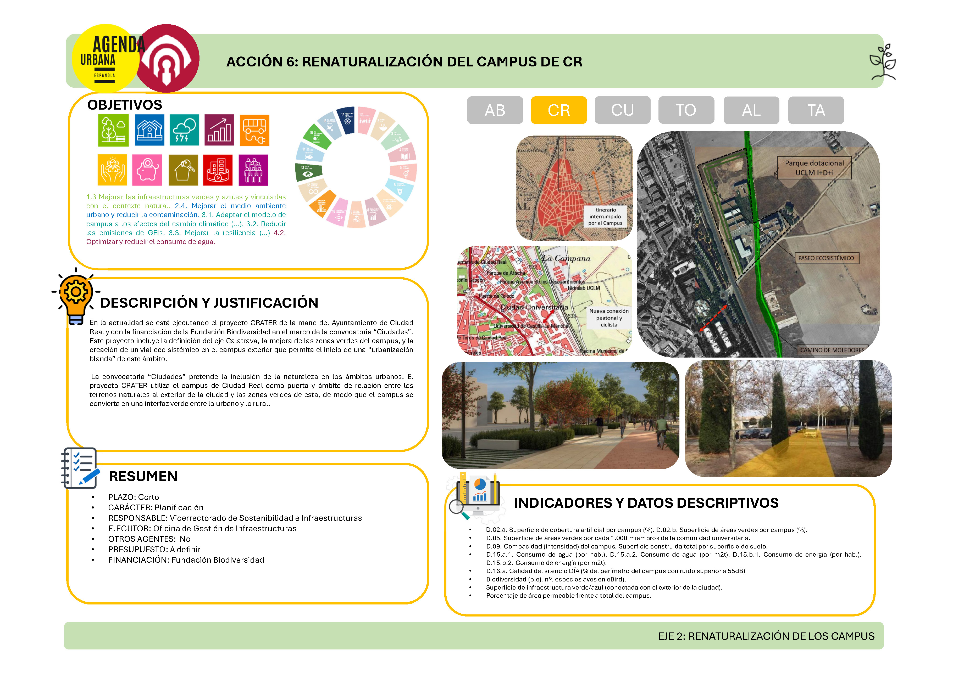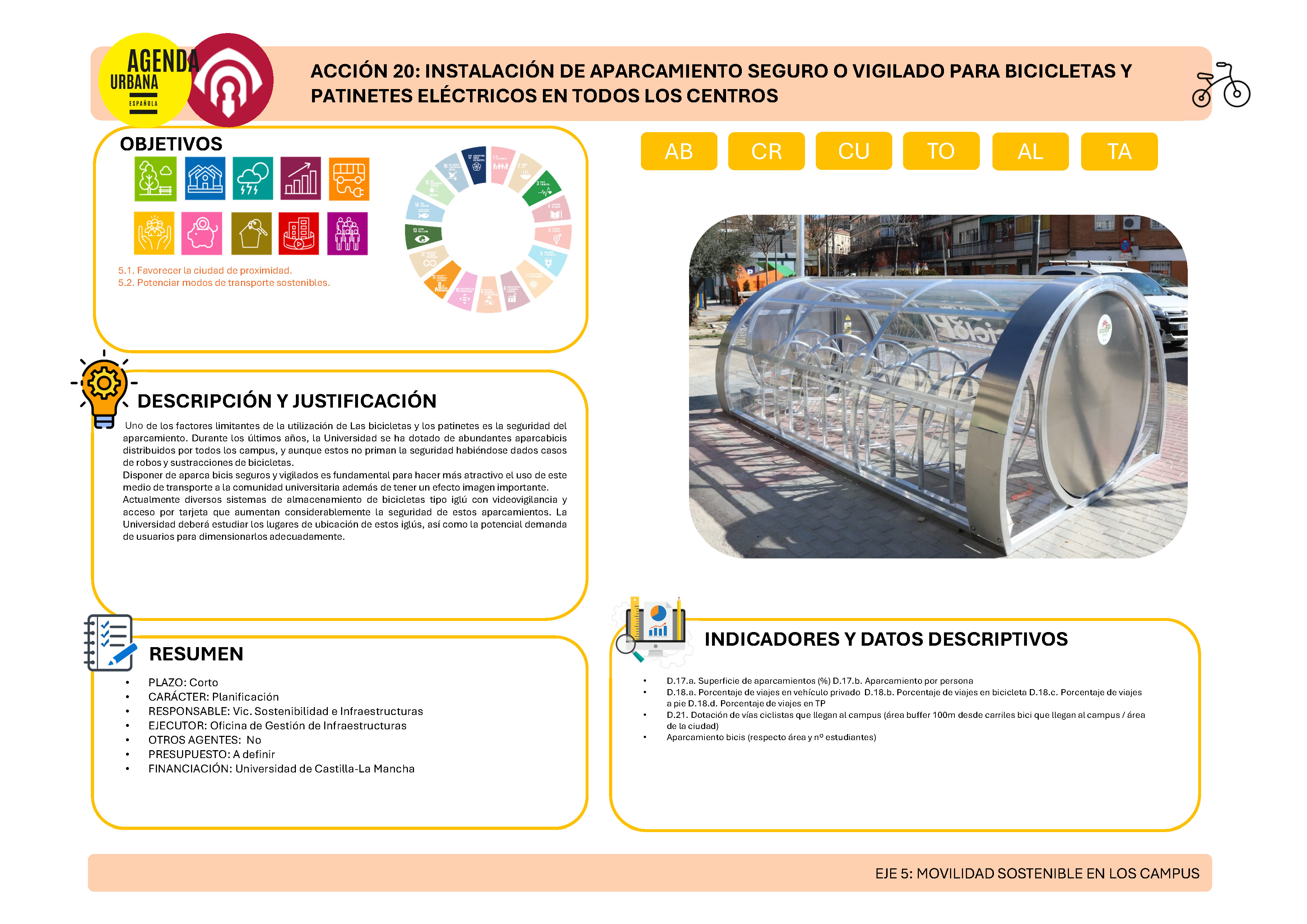 • Un Plan de Acción para la UCLM con 28 propuestas concretas, estructuradas en 7 ejes de actuación, para contribuir a la sostenibilidad urbana desde el ámbito de las competencias de la universidad y sus campus.