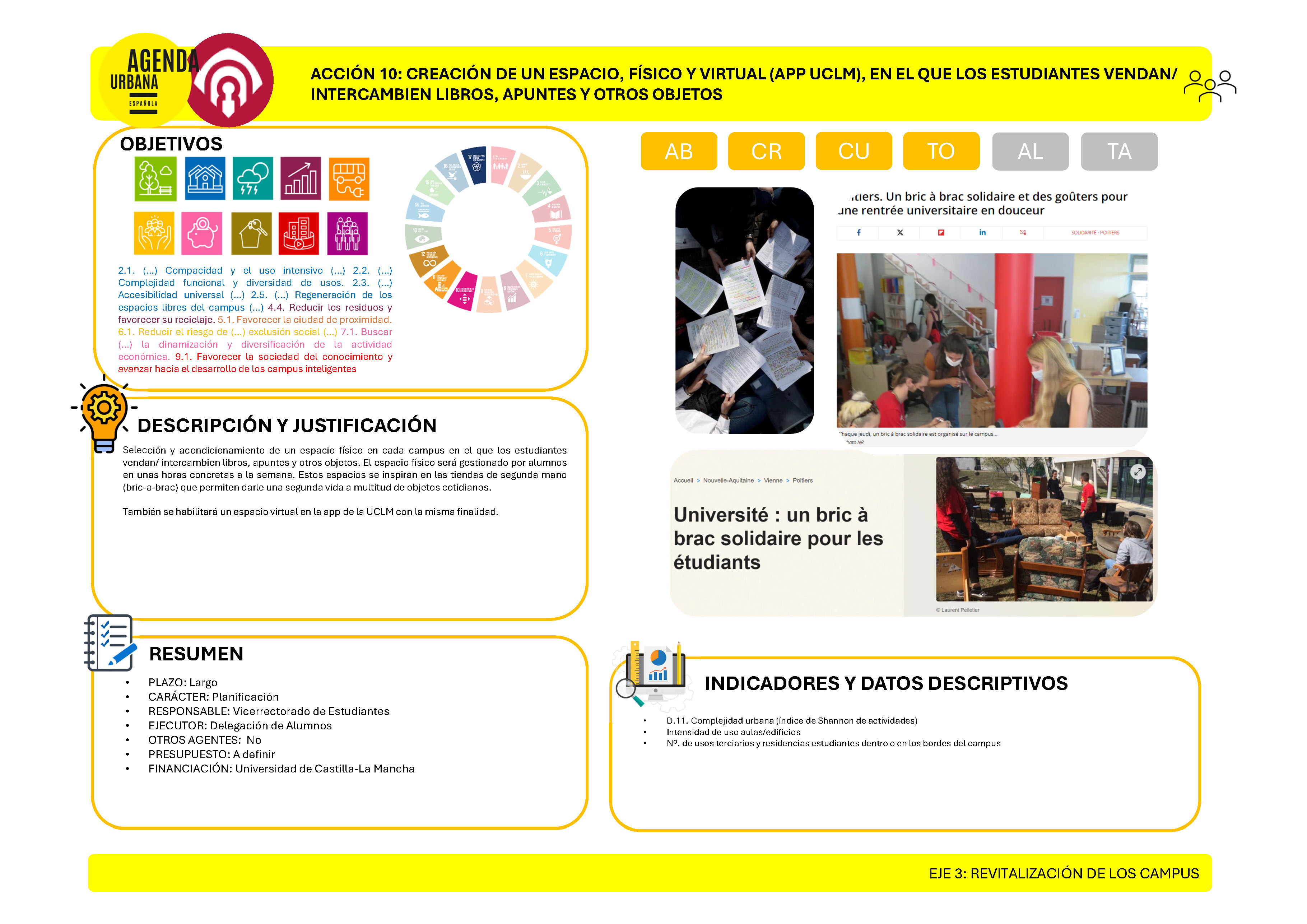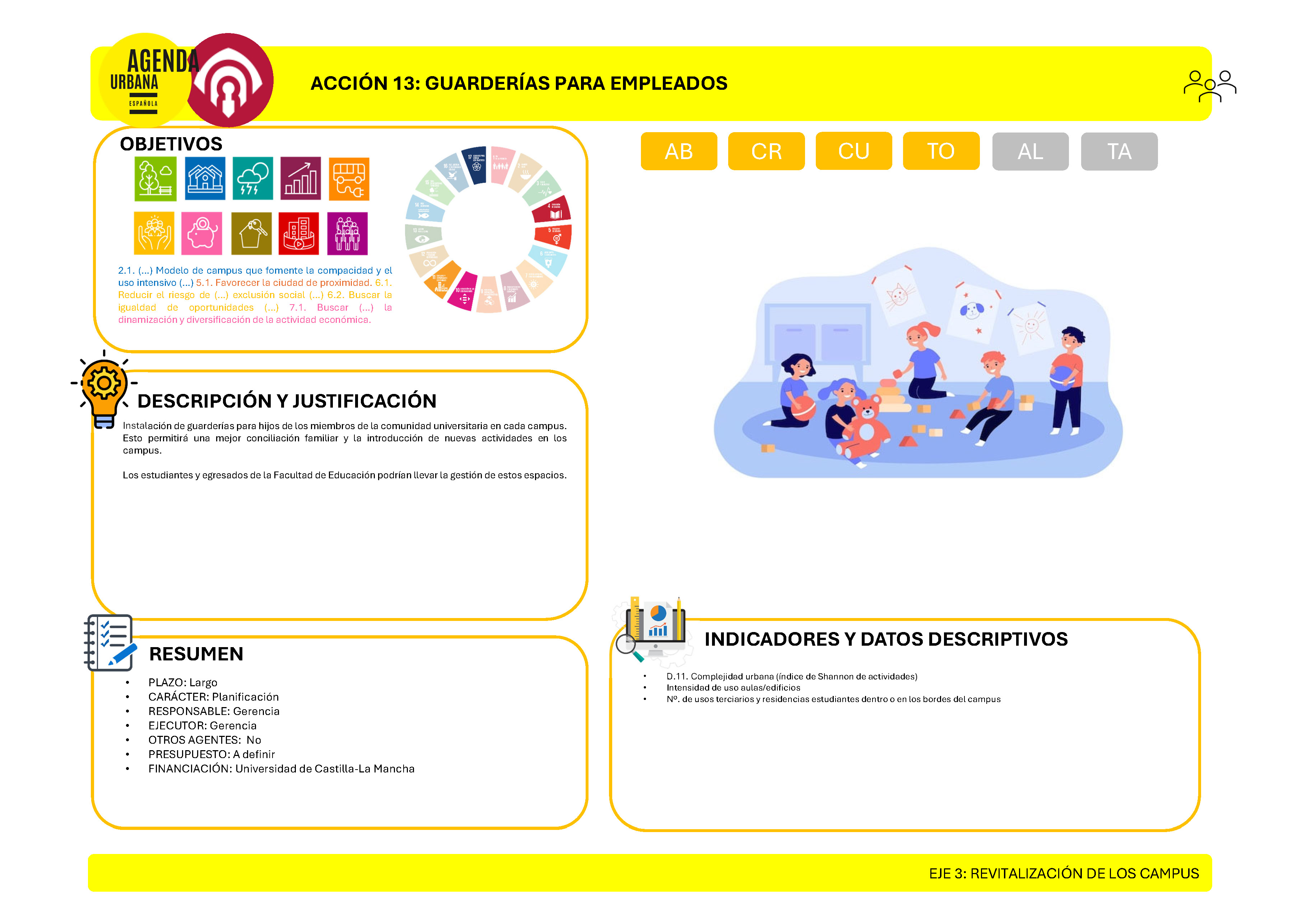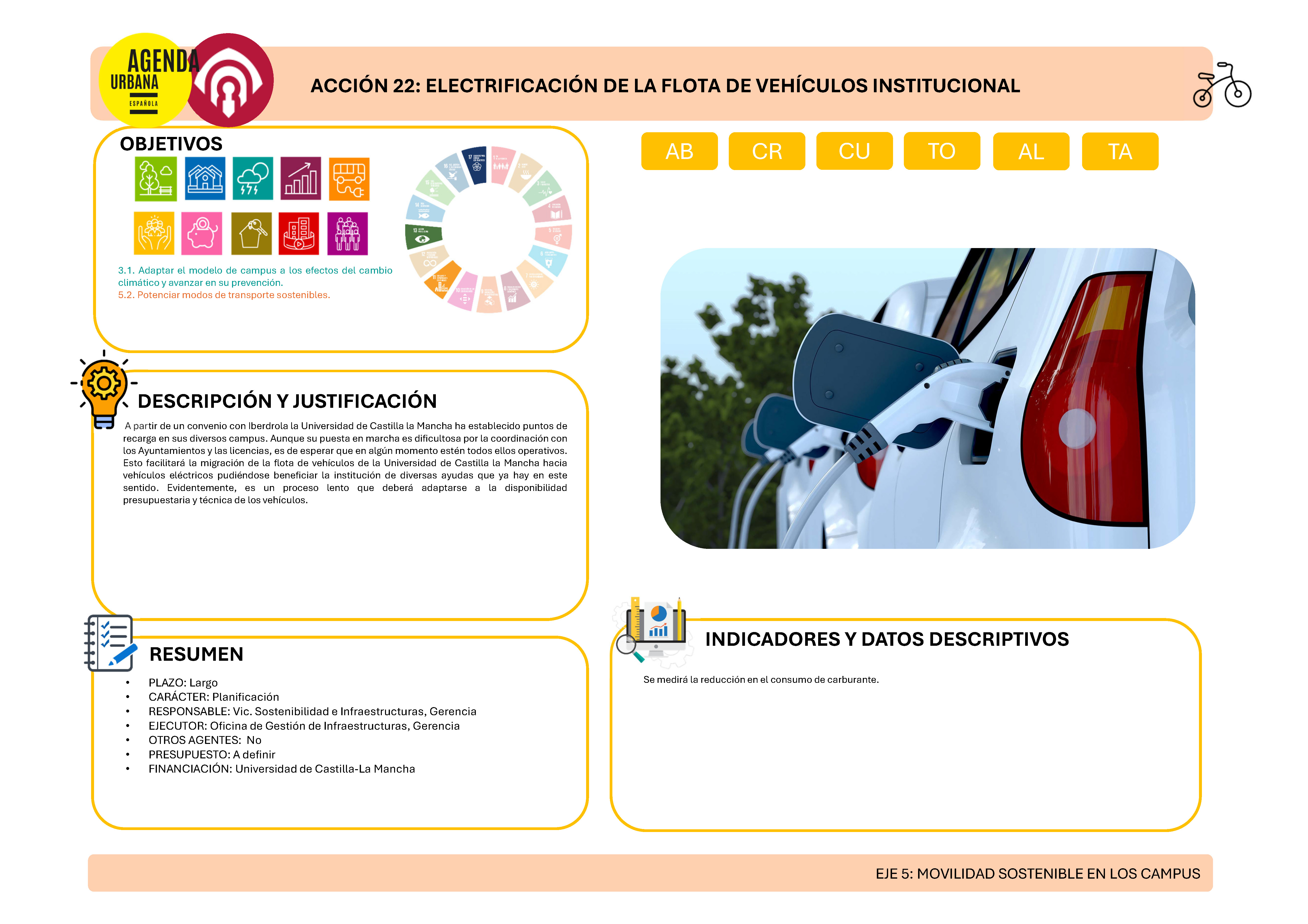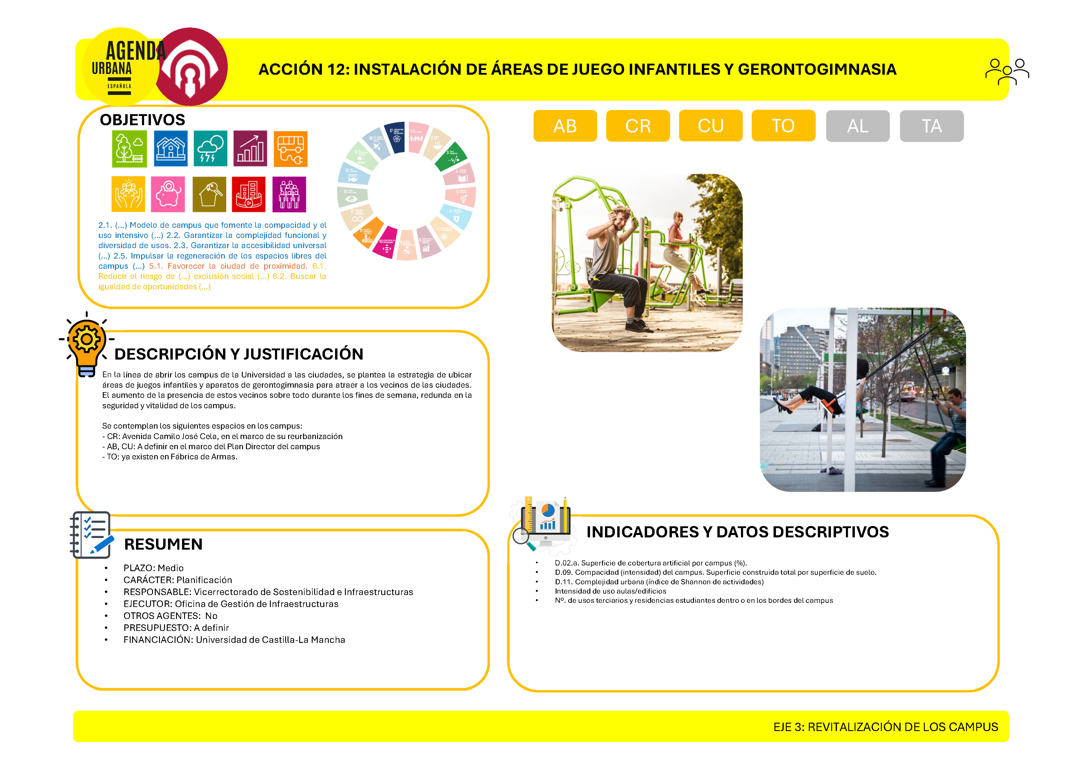 • Un Plan de Acción para la UCLM con 28 propuestas concretas, estructuradas en 7 ejes de actuación, para contribuir a la sostenibilidad urbana desde el ámbito de las competencias de la universidad y sus campus.
