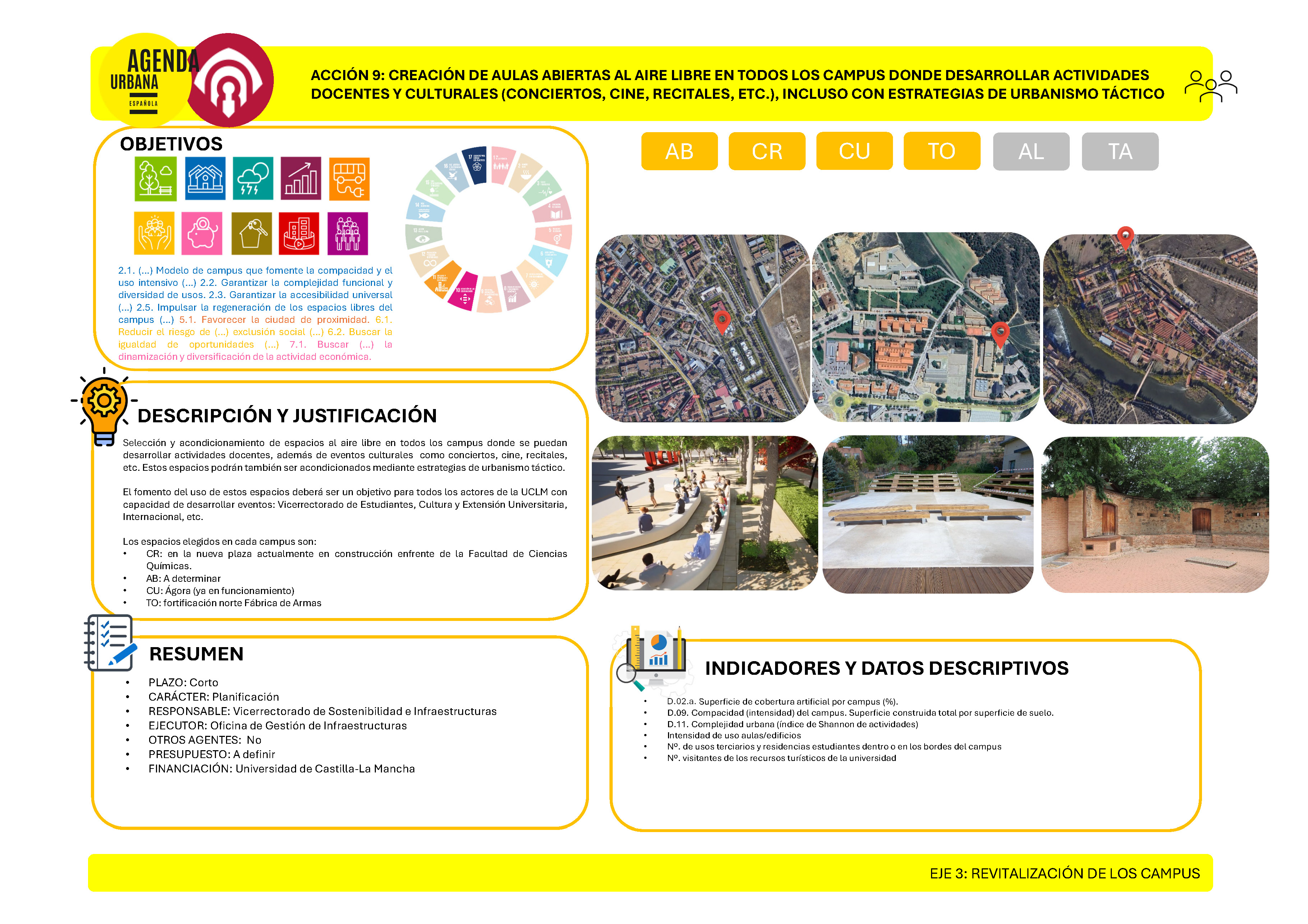 Propuestas para dinamizar los campus mediante la activación de los espacios públicos, en consonancia con los objetivos 2 (modelo de campus) y 6 (cohesión social e igualdad). Ejemplos de ello son la creación de aulas al aire libre o ágoras, la ampliación de la infraestructura deportiva dentro de los campus o la puesta en valor de los recursos patrimoniales de la universidad. Estas medidas buscan también abrir los espacios públicos de los campus a toda la ciudad.