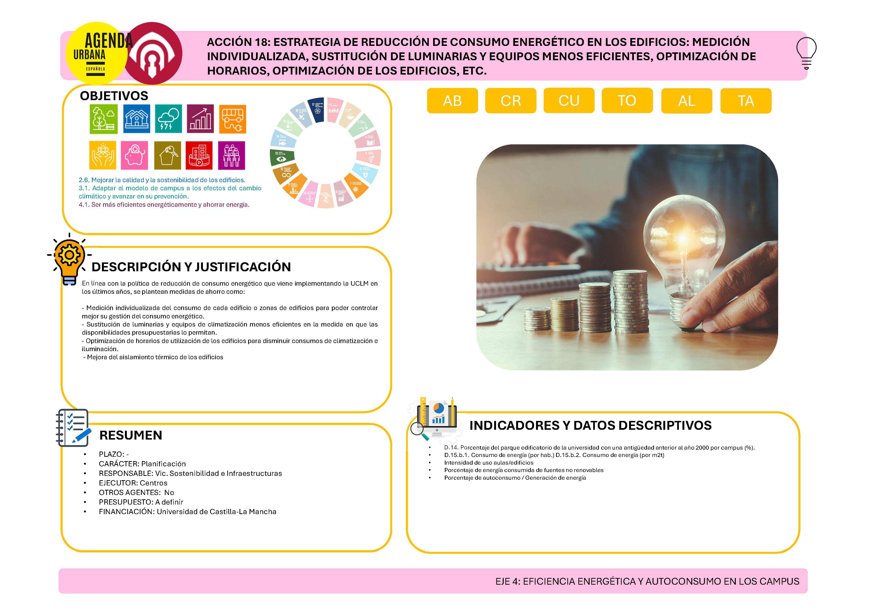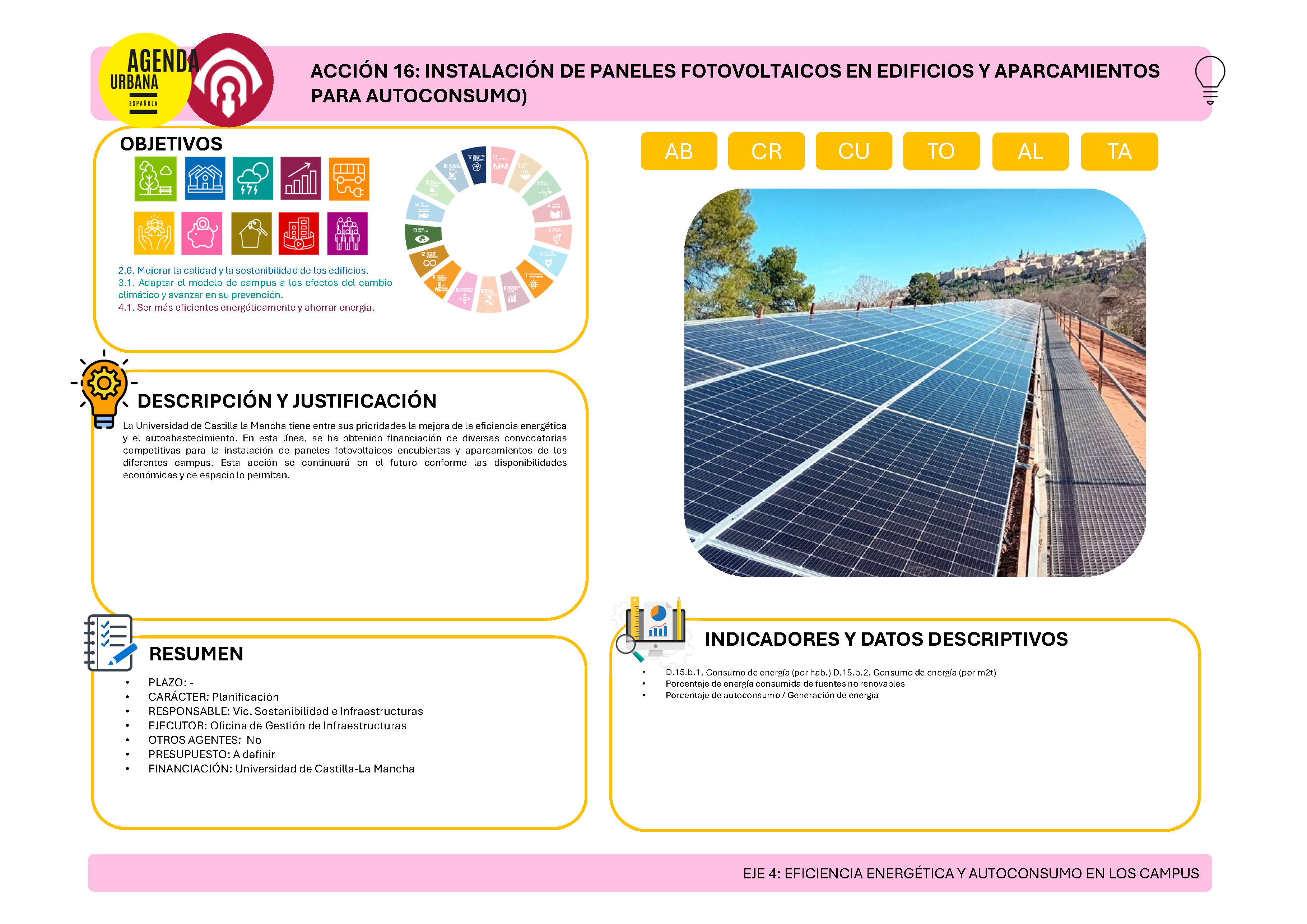Medidas destinadas a reforzar las políticas de eficiencia energética (objetivo 4) en edificios y espacios públicos de la universidad y a fomentar el autoconsumo en los campus de la UCLM, como ya se viene haciendo mediante la instalación de paneles fotovoltaicos y otras tecnologías sostenibles.