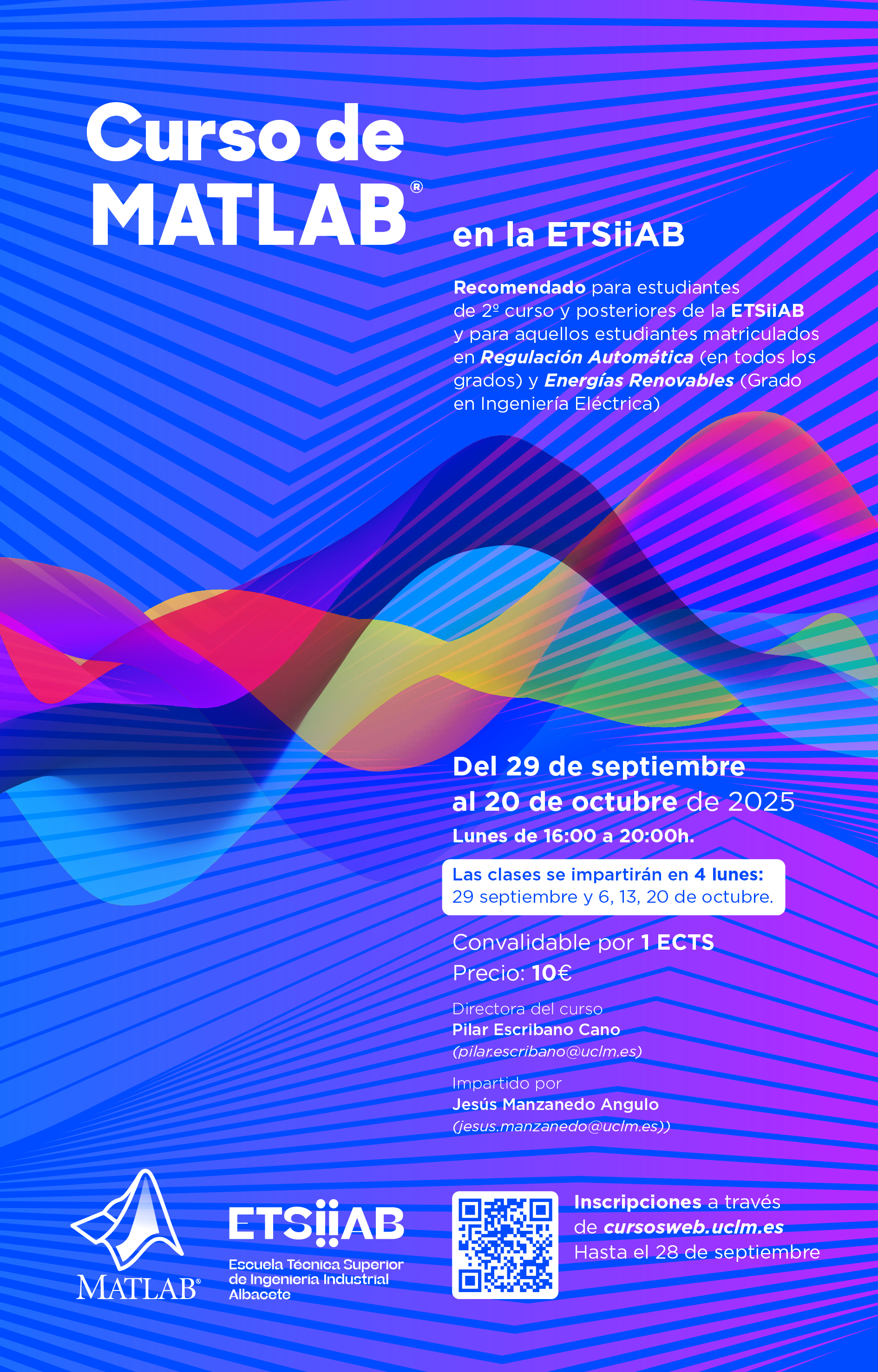 Si eres alumno de 2º curso o posteriores de @etsiiAB te puede interesar este curso de Introducción a MATLAB, que en su primera edición tendrá una duración de 16 horas lectivas. El curso se centra en la introducción de los conceptos básicos de programación de Matlab y se harán algunos ejemplos básicos de ejercicios de algunas asignaturas, como "Energías Renovables", del Grado en Ingeniería Eléctrica y "Regulación Automática", que se imparte en todos los grados.
