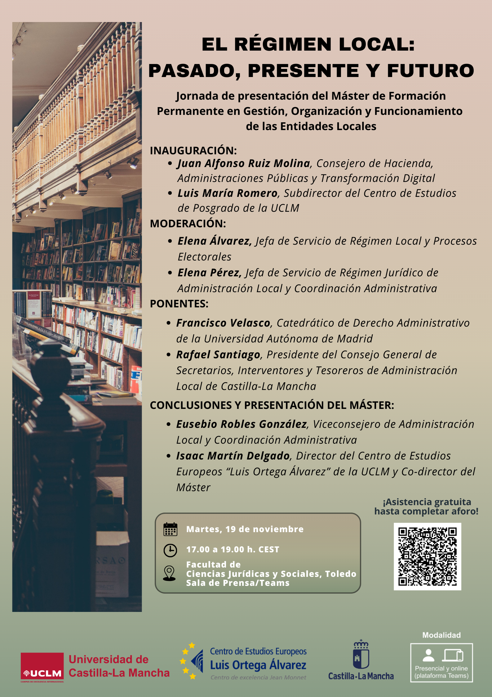 El pasado 19 de noviembre se llevo a cabo la Jornada de Presentación del Máster de Formación Permanente en Gestión, Organización y Funcionamiento de las Entidades Locales, en la Sala de Prensa y por vía Teams, en la Facultad de Ciencias Jurídicas y Sociales de Toledo