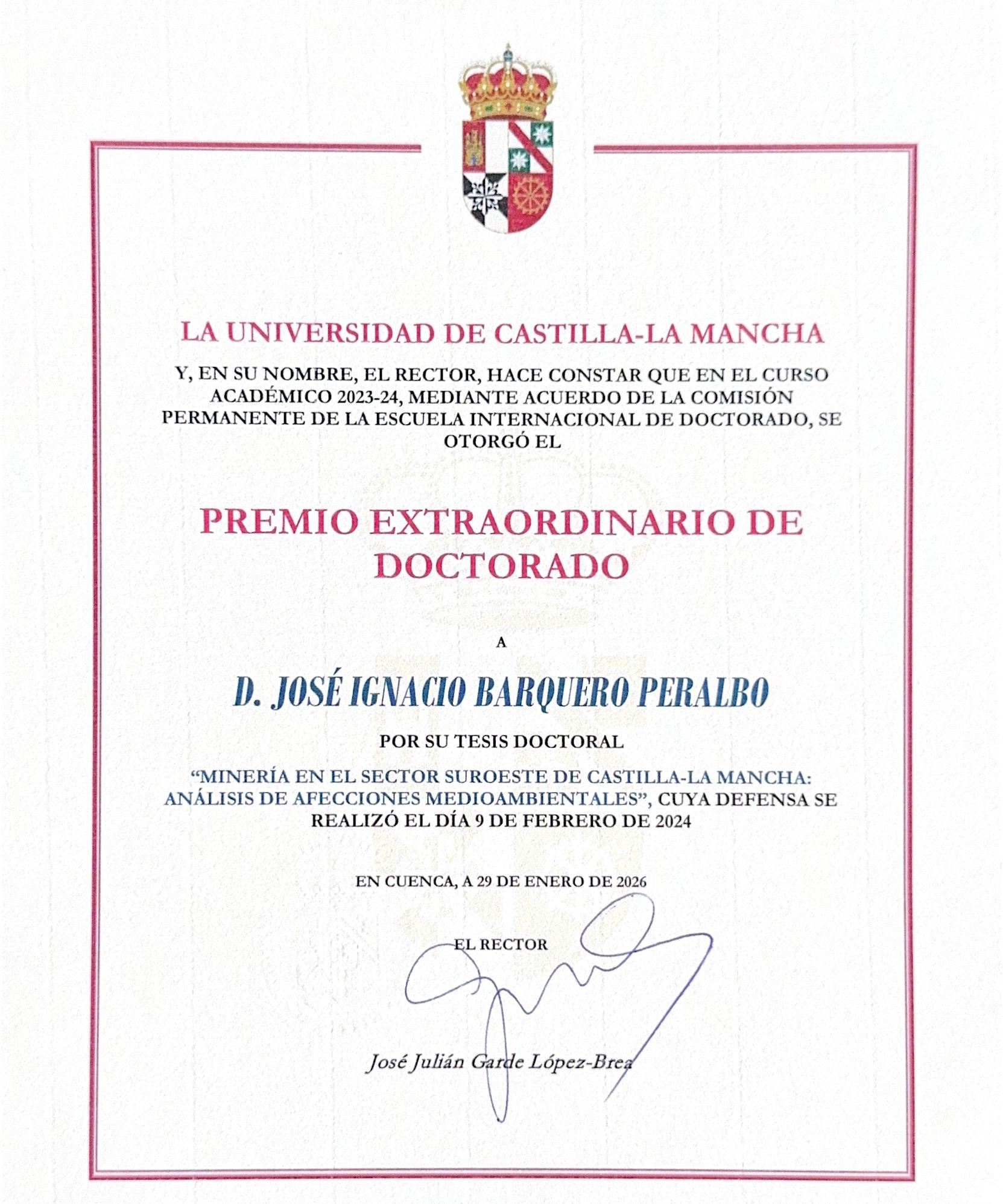 premio a su tesis titulada “Minería en el sector suroeste de Castilla-La Mancha: