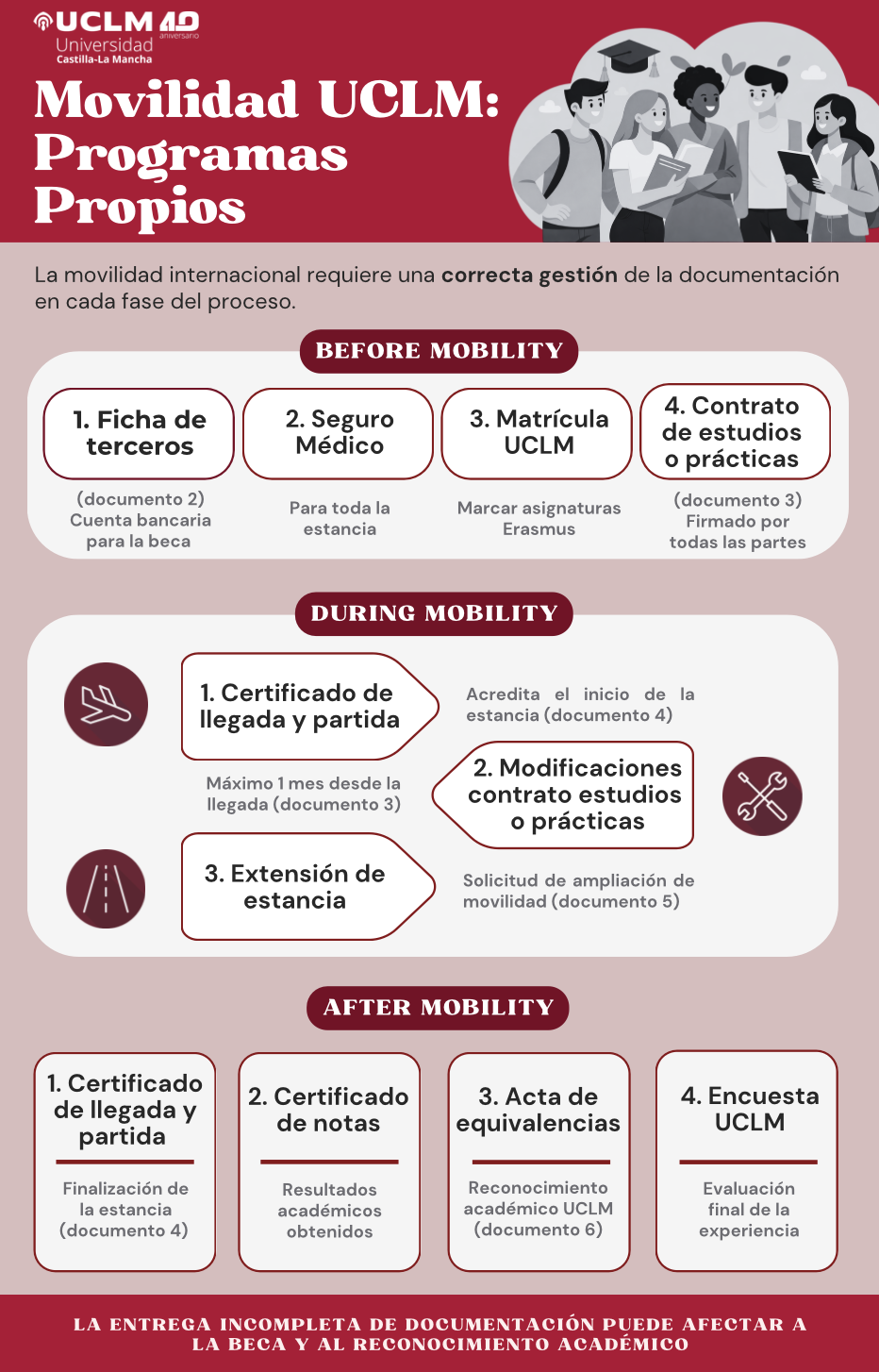 La Universidad de Castilla-La Mancha (UCLM) te ofrece un amplio abanico de posibilidades para completar tu formación en el extranjero bien en Europa bien en el resto del mundo. Los estudiantes pueden realizar parte de sus estudios en otra universidad europea bien realizando una estancia de estudios o una de prácticas dentro del programa Erasmus+.
