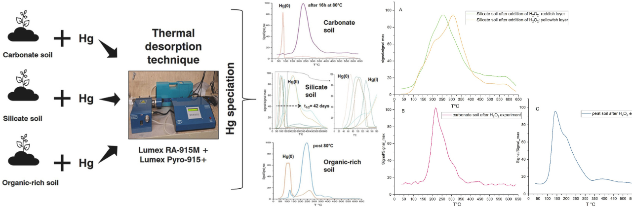 Furthermore, the presence of Hg0 was carefully evaluated since, as already observed, it forms Hg2+, which increases mercury mobility in the pedological cover with important consequences for those soils contaminated and located close to decommissioned or active mining areas and/or industrial sites (e.g. chloro-alkali industries). Experimental runs were thus carried out by using carbonate-, silicate- and organic-rich soils doped with liquid Hg. It was observed that Hg0 tends to be oxidized to form Hg+ and then Hg2+ as a function of soil matrix and reaction time. Surprisingly, the oxidation rate is rather fast, since after 42 days the initial content of Hg0 is halved, thus following an exponential decay.